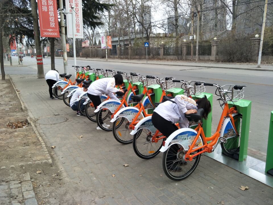 志愿者分别对尧都公园、临汾市人民政府、美特好超市、太阳成城集团体育公司等4处站点的公交自行车、驻锁以及停靠设施进行了全面的清洁。志愿者们带着毛巾和水等清洁工具,在不影响市民租赁的情况下,对自行车进行仔细清洗。大家相互合作,合理分工,积极配合,从车把手到坐垫,从车身到车轮,从自行车到锁桩,同学们用心擦洗,不放过任何一个卫生死角。寒风凛冽中,志愿者们毫不退缩,积极热情地投入到清洁工作中,现场忙碌不已。经过一下午的努力,公共自行车站点的公共自行车焕然一新。同学们的工作不仅是让周边的公共自行车变得洁净,更向社会传达一种正能量:爱护公物,奉献社会,是每一个公民应尽的义务。