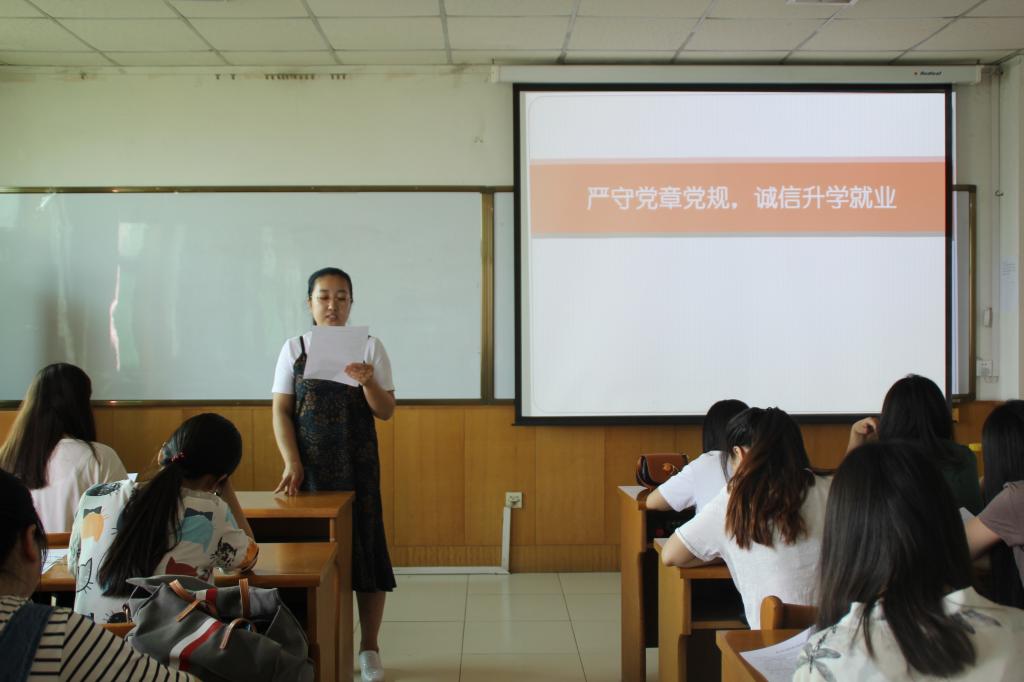 6月19日上午九点,我院在科学会堂A710报告厅召开了“严守党章党规,诚信升学就业”民主生活会。大四、研三的全体党员参加了此次会议,会议由贾静老师主持。