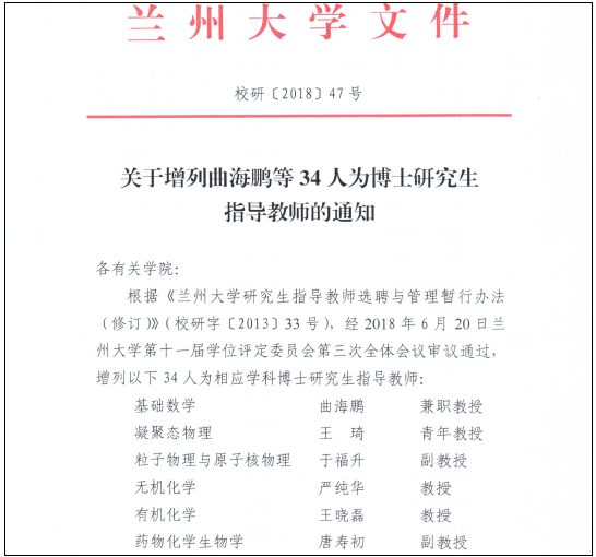 2018年6月20日,兰州大学第十一届学位评定委员会第三次全体会议审议通过,聘我院曲海鹏教授为兰州大学基础数学专业博士研究生指导员工。