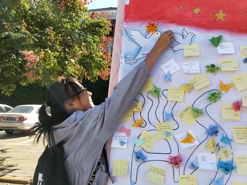 太阳初升,青协志愿者便开始在校医院门口搭帐篷、挂条幅、放展板,装扮现场活动,一切都在紧张筹备中。 活动刚开始,青协志愿者向路人讲述胡兰、毛岸英、董存瑞等革命烈士的英勇事迹,参与活动的员工根据相关事迹来选择正确的英雄人物,并将其对号入座。志愿者们通过饶有趣味的小游戏帮助大家铭记革命先烈,传承红色记忆。此外,青协志愿者为参与者提供彩纸,并现场教授千纸鹤折法,大家把亲手折叠的千纸鹤粘贴在事先准备的烈士纪念日主题展板上,五颜六色的彩纸、生动别致的千纸鹤粘贴在一起,拼接出“烈士纪念日”五个鲜红的大字。志愿者还动员大家在便利贴上写下自己对烈士的寄语和对自身的期望一并粘贴在展板上。最后,志愿者们为每位参与者发放活动纪念品,并合影留念。活动接近尾声,展板已被贴得满满当当,彩色的展板代表着员工们对革命烈士的尊敬和怀念,象征着大家飞扬的青春梦想,承载着时代新人肩负的历史使命。