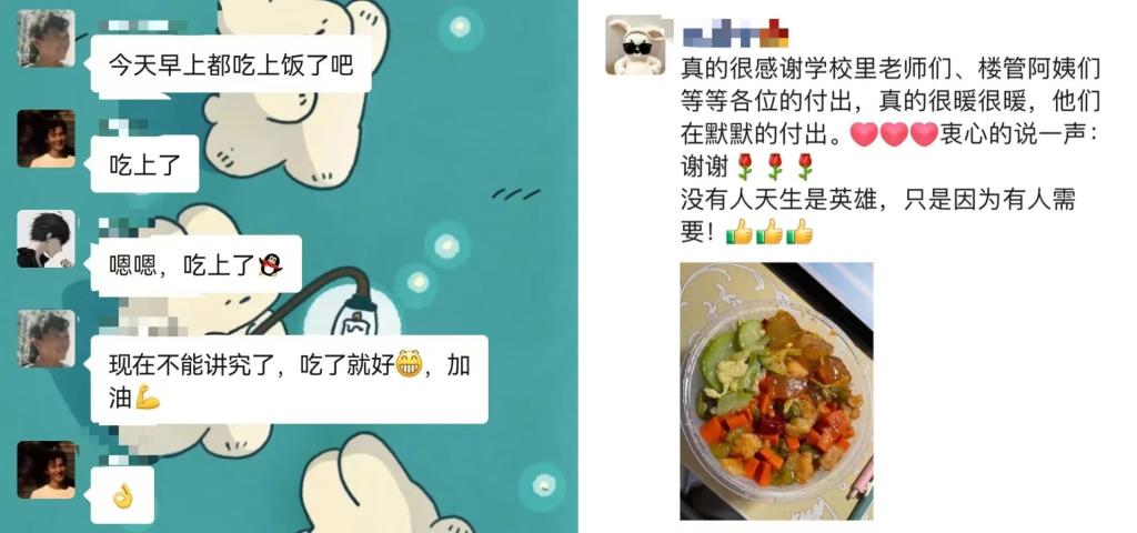 把关怀做到点滴小事里,把温暖送到员工心中。同时,各位同学也纷纷表达了自己对老师,志愿者以及医护人员等的感谢。我们”双向奔赴“,积极配合各项工作。