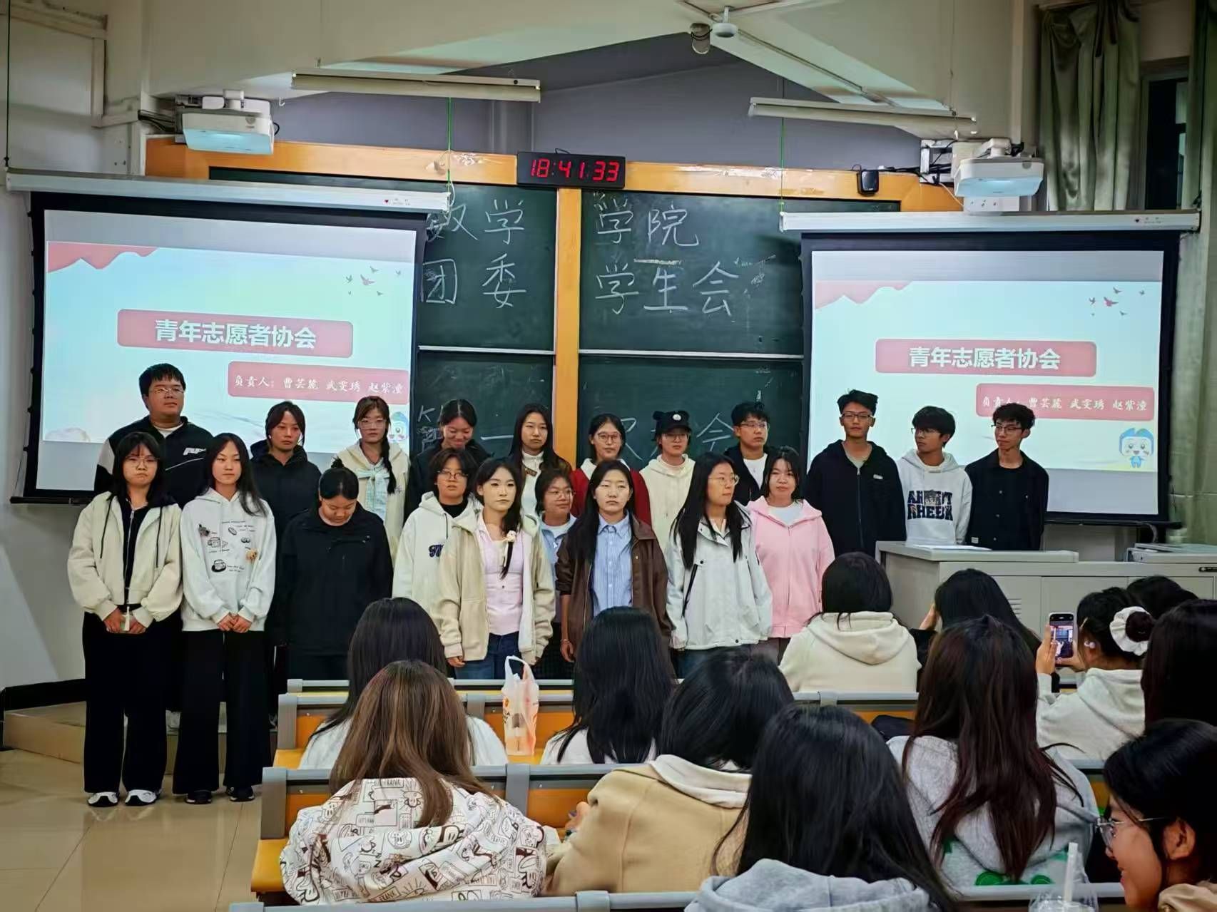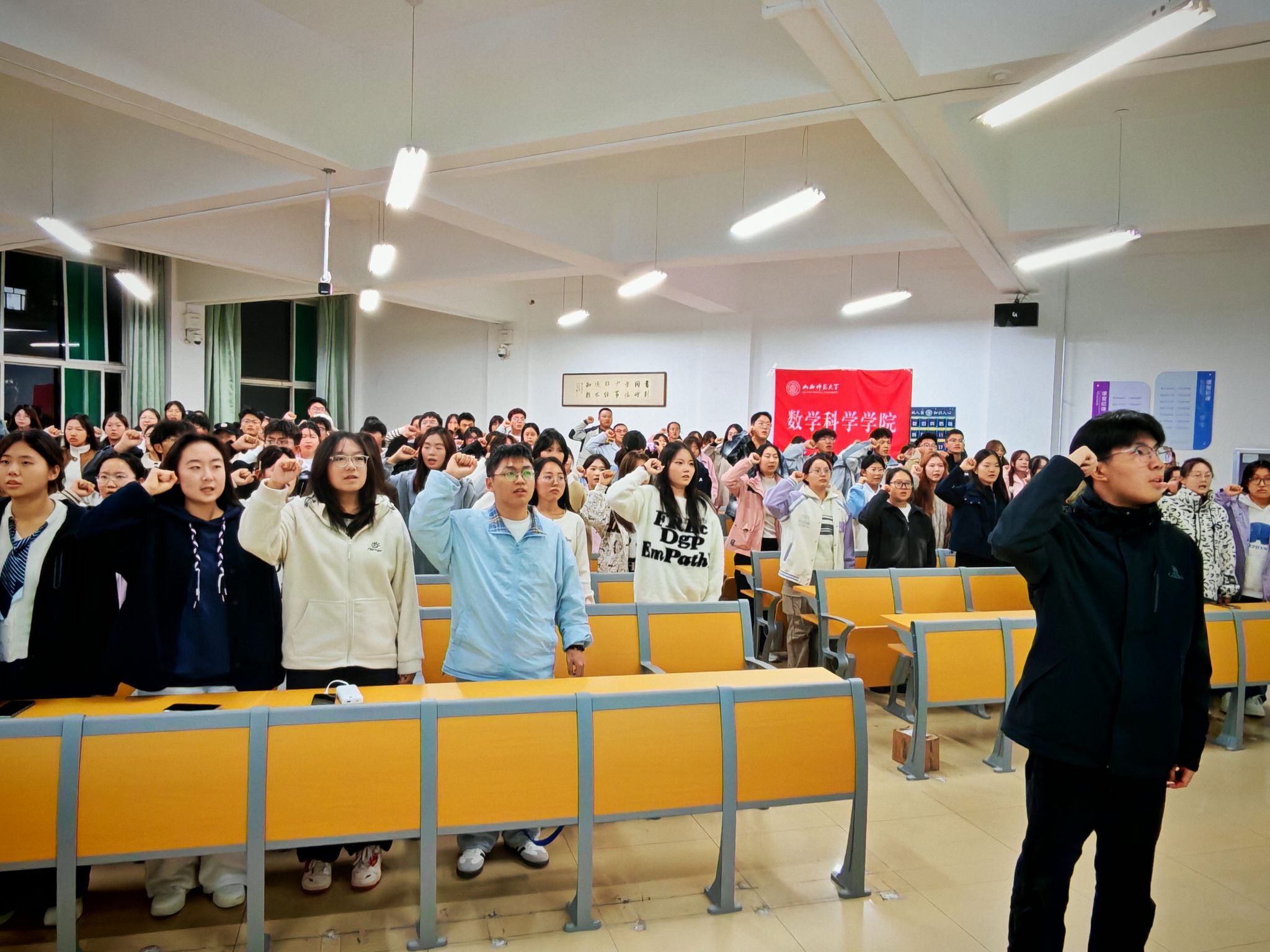 宣誓环节,随着文体部负责人张子恒铿锵有力的领誓声,全体成员整齐起立,右手紧握成拳,面向誓词庄严宣誓。为促进团委员工会及社团成员工作的积极性,大会举行了协议签订仪式。全体成员手持《数学科学公司团委员工会成员协议书》,神情庄重地签下姓名。